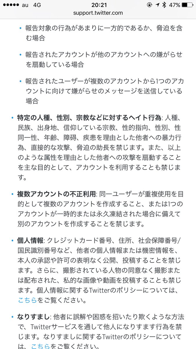 あなたのこのツイート、ツイッタールール( https://support.twitter.com/articles/253501 )違反ですよ→Twitterではユーザーが安心してさまざまな意見や信念を表現できるよう、嫌がらせや脅し、または恐怖を与えて他のユーザーが発言できないようにするといった、攻撃的な行為を禁じています