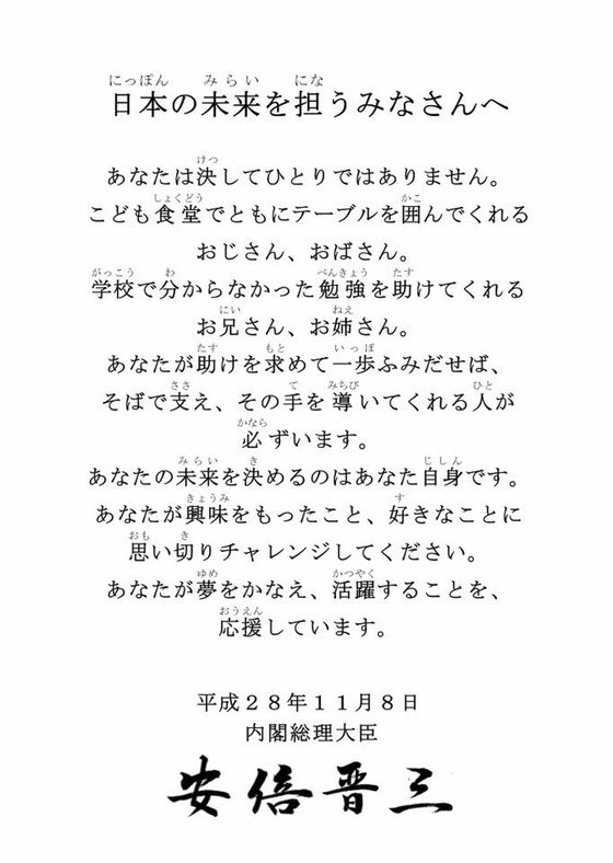 政府は日本の未来を担う子供たちに導きの手を差し伸べる気はないのでしょうか?詳細は以下から。 ツイッターで「日本の未来を担うみなさんへ」と題された安倍首相から日本の子供たちに宛てられたのポエムが物議を醸しています。 「あなたは決してひとりではありません」と始まり、「あなたが助けを求めて一歩ふみだせば、そばで支え、その手を導いてくれる人が必ずいます」とされています。 しかし、そこで例示されているのが「こども食堂でともにテーブルを囲んでくれるおじさん、おばさん」であり「学校で分からなかった勉強を助けてくれるお兄さん、お姉さん」なのです。 日本の子供たちの教育を司る日本国の行政府の最高責任者である内閣総理大臣という立場にある安倍首相は子供たちに向けて何の約束すらせず、民間人に子供の手助けを丸投げしているのです。 実際問題、こども食堂は子供の貧困対策として認知されていますが、その多くが寄付やボランティアによって運営されており、国が援助を行っているわけではありません。 「あなたの未来を決めるのはあなた自身です。あなたが興味をもったこと、好きなことに思い切りチャレンジしてください」と述べ「あなたが夢をかなえ、活躍することを、応援しています」と結んでいますが、子供の貧困は6人にひとりにまで拡大し、奨学金返済の問題から大学進学を諦める子供も少なくないのが現状です。 興味をもったこと、好きなことに思い切りチャレンジできる環境を作るのが国の努めだということを果たして理解しているのでしょうか? そもそもその子供を産み育てる環境が整っておらず、育児休暇や待機児童の問題はもちろん、非正規雇用から脱出できず結婚に踏み切れない若者も少なくありません。 少子化に歯止めが掛からず、生まれた子供も家計や家庭環境によっては望んだ進路を選べないケースも多々見られる状況があり、子供たちを「日本の未来を担うみなさん」と考えていながら「応援しています」などというメッセージを流している場合ではありません。 当然のことながらこの丸投げポエムには批判や疑問の声が上がっています。 http://buzzap.jp/news/20161111-nippon-no-mirai-poem/ 大猩々総書記@Gorilla_sworn やべえな 子ども食堂にすらケチを付けるのかよ やっぱりお前らと安倍はお似合いだわ 愛国や保守を語るくせに子供すら作らずに少子化に貢献するクズばかり 働きたくないのは勝手だが世間を恨んで足を引っ張るみたいな真似はやめろよ https://twitter.com/Gorilla_sworn/status/797702937560510464 安倍って種無しだし「子供」という存在が憎くて憎くてしゃーないんだろ https://twitter.com/Gorilla_sworn/status/797082364903976961 メディシス@Medicis1917 この安倍晋三様のありがたいお言葉を極めて簡潔に要約しますと、「僕は何もしないので勝手に頑張ってね」という事になりますね。全国のこども食堂運営者の方々、キレてもいいと思う。 https://twitter.com/Medicis1917/status/796992366305345536 館野公一@mandolinbum あまりに無神経な文書。こんなものを保育所などに総理大臣という名前で送りつけて、何がしたいのか。苦労して子ども食堂を運営してるのは、あんたじゃない。 学習サポートをしてるのもあんたじゃない。 子供の貧困を一瞥もせず、差別やヘイトを放置どころか温床を作ってきたあんたに言う資格はない。 https://twitter.com/mandolinbum/status/797208182514794496 川口創(弁護士)@kahajime 子ども食堂が必要な社会になってしまっていることについて、全く責任を感じていないことに、のけぞるほど驚いた。 http://twitter.com/kahajime/status/797055560692547584 リュウセイmk2@ryuseimk2 何故子ども食堂が出来たのか全くわかっていないところがもうね、アホかと、バカかと、この安倍晋三は。 https://twitter.com/ryuseimk2/status/796992875808493568